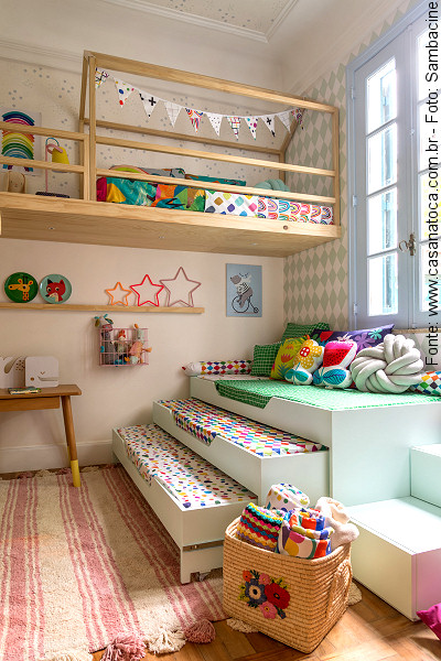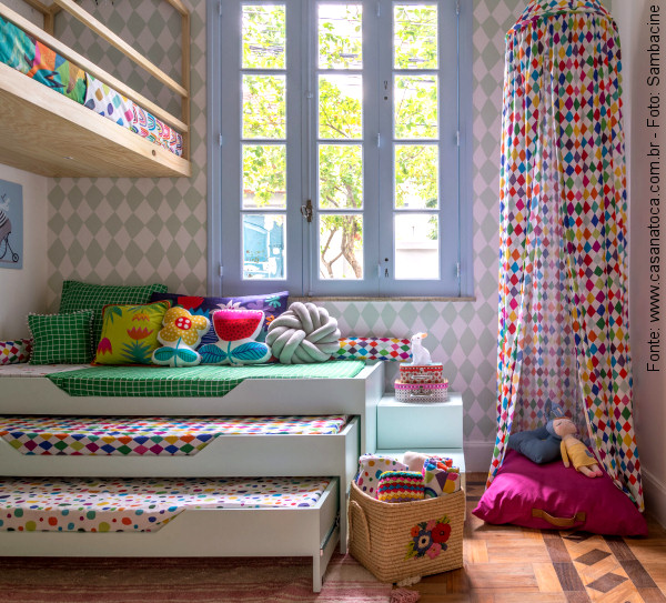Mezanino, tricama, papel de parede e tijolinho: tudo se harmoniza bem no “Quarto dos Primos” de Hana Lerner na mostra “Casa NaToca“.