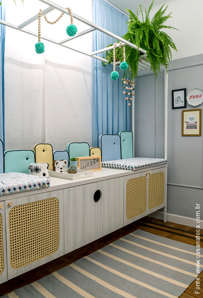 O trocador foi desenhado pelas arquitetas e foi feito sob medida em serralheria e madeira, com detalhes em palhinha e cabeceira estofada pela UniDesign, reforçando o visual retrô, que é o tom que permeia toda a mostra. O charme final fica por conta do garimpo de peças feitas à mão, que compõem o enxoval da Fernanda Amorim, e pelos objetos recortados em madeira do Ateliê Baobá Pitucos, além da bela pintura de árvore assinada pela “A Casinha“. Uma delícia de ambiente!