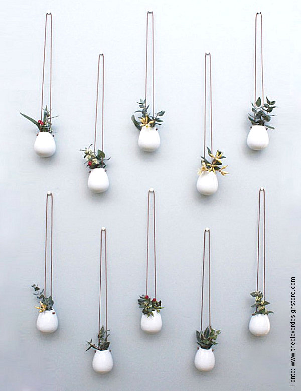 Já a australiana LoveHate criou esses pequeninos vasos em cerâmica que, se utilizados em um conjunto, formam um verdadeiro “painel verde”. Foram duas grandes ideias: a primeira, o tamanho diminuto dos vasos que deixam qualquer elemento delicado e elegante; a segunda, utilizar um cordão de couro para pendurá-lo em um gancho, que pode estar ou não preso a uma parede. Ou seja: se você desejar criar um “corredor de vasos” que pendem do teto, o efeito também será muito interessante.