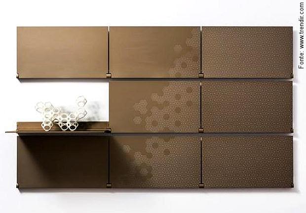 Abertas ou fechadas as prateleiras decoram e agradam em qualquer ambiente moderno. O inovador sistema, já patenteado, foi batizado como “Riveli”, palavra que significa “revelar”, em italiano, e é essa a impressão que as prateleiras dão: de revelarem algo novo, diferente, mexendo com o lúdico de nossas mentes. Feitas em alumínio magnetizado, elas são montadas na parede em módulos individuais que abrem e fecham de acordo com a necessidade e vontade do dono da casa. Disponíveis em quatro belas cores metálicas – preto, branco, dourado e cobre – também podem ser utilizadas e customizadas como quadro magnético, quadro branco ou painel que recebe tinta para pintura artística.