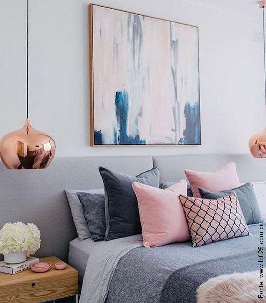 Outro espaço onde a dupla se encontra lindamente: no quarto com vários tons de cinza – inclusive com alguns tendendo para o azul… – o rosa fica perfeito complementando o enxoval da cama e em alguns acessórios. De novo, os pendentes em cobre que iluminam os criados mudos marcam presença muito bem.