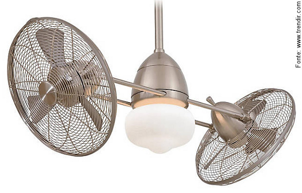Num misto de “vintage” com o “estilo industrial” tão em voga na atualidade, o ventilador da norte americana “Minka Aire” reúne duas peças menores girando em torno de um eixo encimado por uma luminária em opalina branca. O tom do metal também é suave, saindo do tradicional cromado, mas a peça está disponível também em tom de bronze escurecido com muito charme.