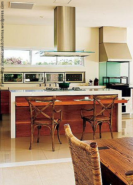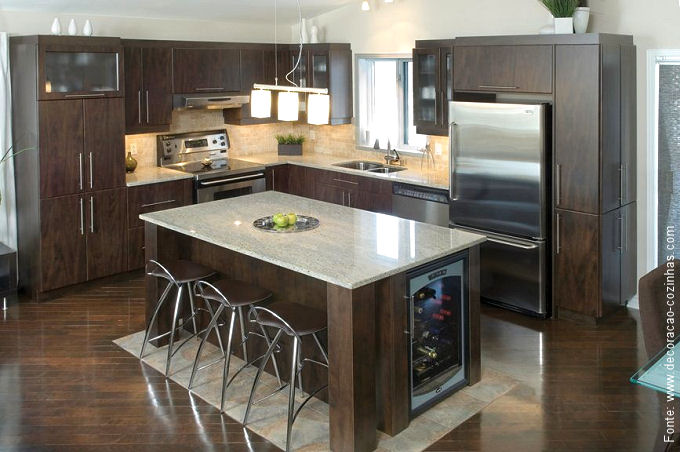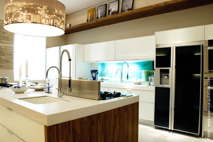 Já mostramos aqui mesmo no blog algumas belas cozinhas com as chamadas “ilhas” centrais que normalmente conjugam a pia com o misturador, um cooktop e uma bancada para refeições rápidas. Mas há também as mais “incrementadas”, com gavetas refrigeradas, caves para vinho, coifas e exaustores, entre outros itens que tornam o espaço mais luxuoso mas também mais funcional. Em resumo, depende do projeto da cozinha como um todo o que vai ser localizado na ilha: mas é fato de que elas se tornaram tendências e também , um sonho de consumo.