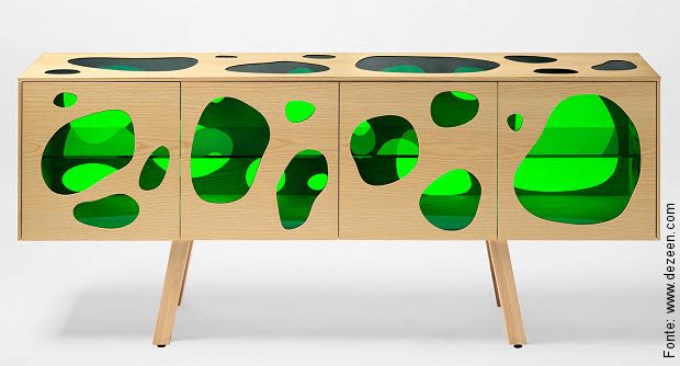Feito de pinho ou freixo, o buffet dos Campana chama atenção pela forma e cor dos recortes fechados em vidro.