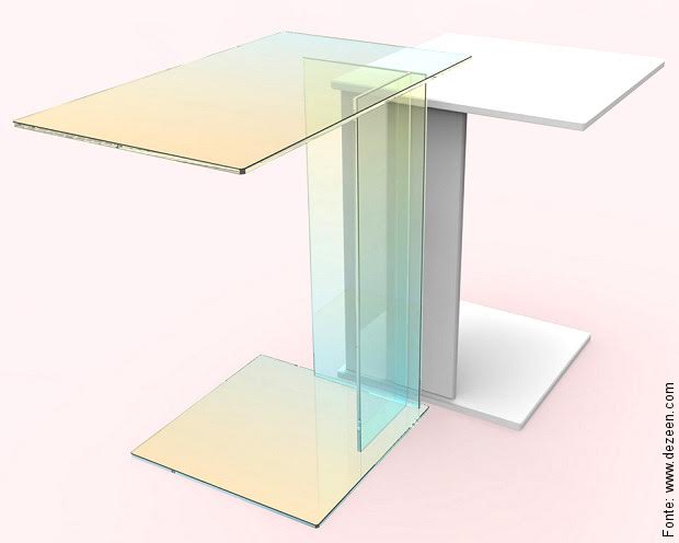em geral. Além de móveis como os que vamos mostrar a seguir, também instalações e espaços de exposição do evento receberam vidros onde a cor é o destaque.