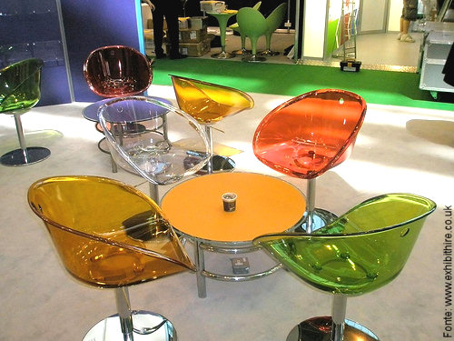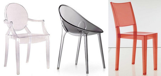 O superstar do design atual também gosta muito de brincar com as transparências. Philippe Starck já desenhou vários modelos explorando a boa forma e a sensação de leveza da translucidez. Sua cadeira “Louis Ghost” é prova disso, além de “Mr. Impossible” e “La Marie“, todas na imagem.