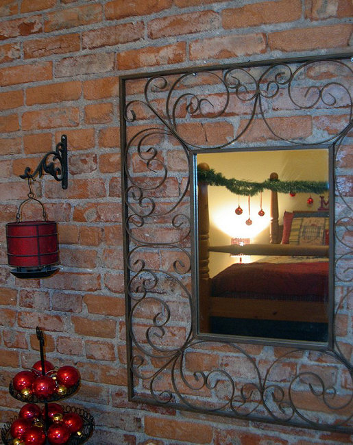 Uma lanterna de papel, algumas bolinhas em vermelho e um belo espelho em ferro fazem a decoração de fim de ano deste quarto muito aconchegante. Repare no reflexo do espelho que trata-se de uma decoração natalina!