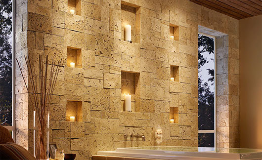 A parede revestida em pedra já foi preparada com nichos para receber velas, em qualquer época do ano. Trata-se de um lindo banheiro, mas a ideia pode ser repetida em diversos ambientes.