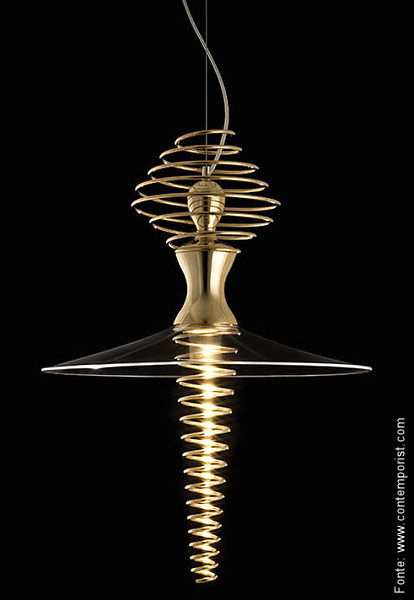 Criada pelo designer espanhol Sergi Venturi, “Mia Ballerina” parece mais uma escultura do que uma luminária. Na verdade, a sensação de movimento é o que transforma o objeto em luminária, já que a peça é feita de espirais metálicas polidas à mão e banhadas em ouro 24 quilates, enquanto a saia é feita em acrílico transparente.