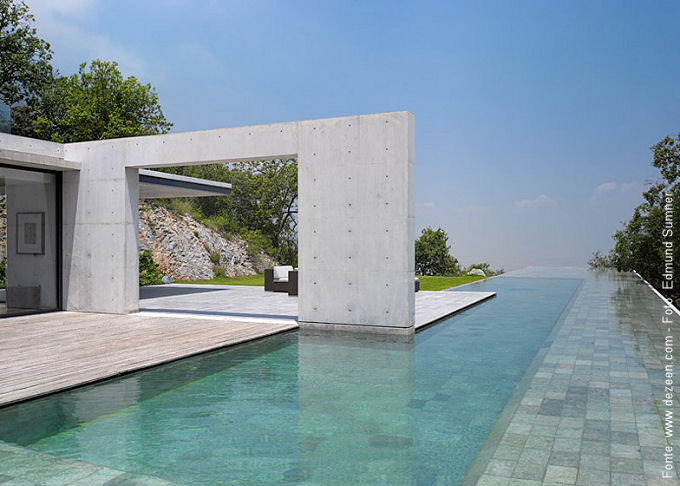 Mas um dos destaques da residência é, sem dúvida, sua piscina de borda infinita, que termina em um desfiladeiro, com larga vista para o horizonte, obviamente. Feita em balanço e acompanhada por um paredão de concreto, é das mais bonitas do tipo. A suíte master é voltada para a piscina, deixando certamente seus ocupantes com uma das melhores vistas da casa.