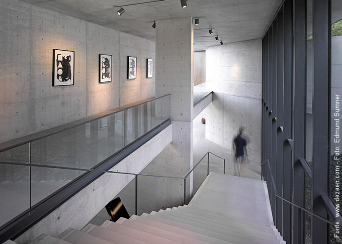 Um pouco do interior da residência, toda em concreto aparente: galeria e escadaria.