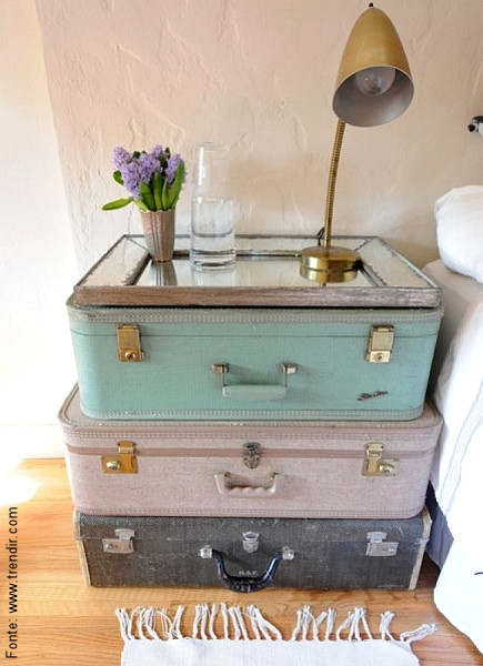 Primeiro já um “clássico”: o uso das malas antigas empilhadas como mesinha de cabeceira ou lateral, com topo adornado por diversos itens antigos – aqui a escolha recaiu sobre um belo espelho, bem do tamanho da lateral da mala superior, além de uma útil e bonita luminária também antiga. Além de reaproveitar e de ser bastante útil, o charme das viagens de outrora não passa despercebido. Baús e malas bem grandes também são usadas, até com tampos em vidro.