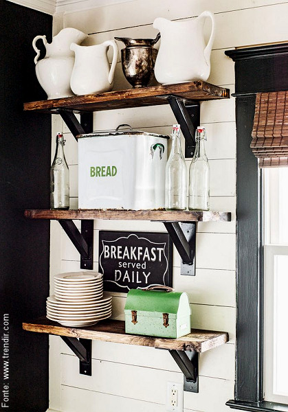 Aqui é possível se apostar que toda a cozinha da casa fica bem dentro do “espírito vintage“. Se não, foi tudo muito bem preparado para que neste canto o ar fosse realmente de passado. Repare no revestimento em placas de madeira da parede, na janela ao lado e nos itens que ficam sobre as prateleiras, bastante rústicas e quase… industriais! Jarros e pratos em louça antiga branca, uma lata para guardar pão e uma lancheira à moda antiga, além de garrafas de vidro reaproveitáveis. Não há quem não diga que estamos nos primeiros anos do século XX!